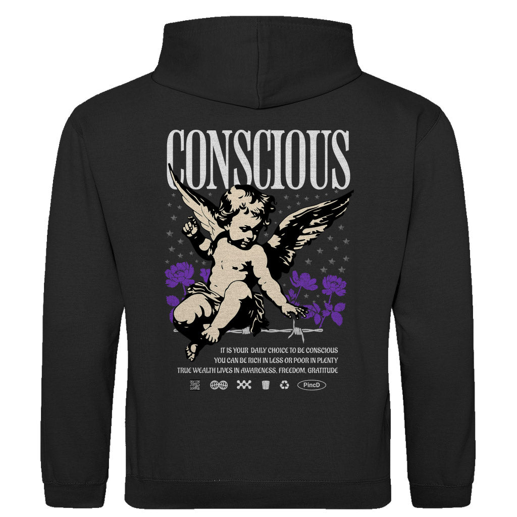 Entdeck den Streetware Hoodie - Conscious . Auf der Rückseite dominiert ein markantes Engel-Motiv, das für Bewusstsein, Achtsamkeit und Freiheit steht. Umgeben von kräftigen, violetten Rosen und einem Sternenhintergrund symbolisiert es die Verbindung von Stärke und Spiritualität.